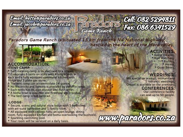 Paradors Game Ranch is situated 15 km from the N4 National Highway, nestled in the heart of the Mara valley.