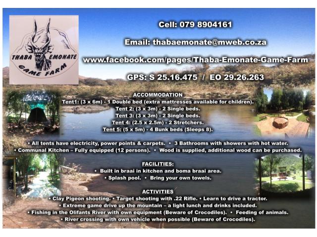 Thaba Emonate Game FarmCheck with sellerGame Farms Groblersdal (Mpumalanga) February 2, 2016Thaba Emonate Game Farm is situated on a game farm close to the Olifants River in the Limpopo province. ACCOMMODATION: * 1x Executive tent with double bed. * 2x Bow tents with 2 single beds in each tent. * 1x Bow tent with 2 luxury stretchers. * 1x L... -