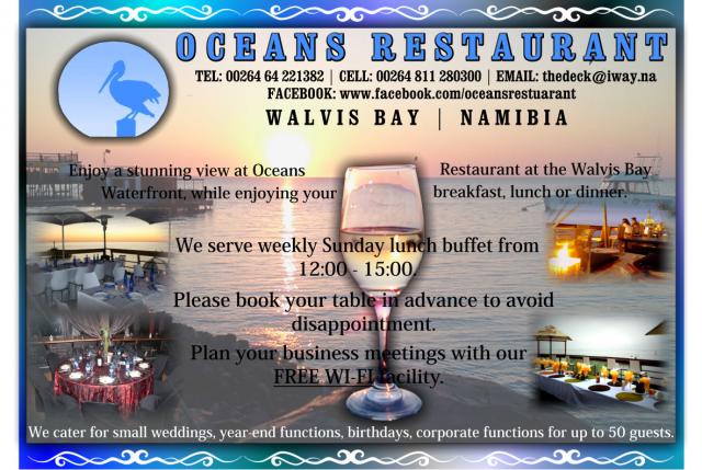 Enjoy a stunning view at Oceans Restaurant at the Walvis Bay Waterfront, while enjoying your breakfast, lunch or dinner.